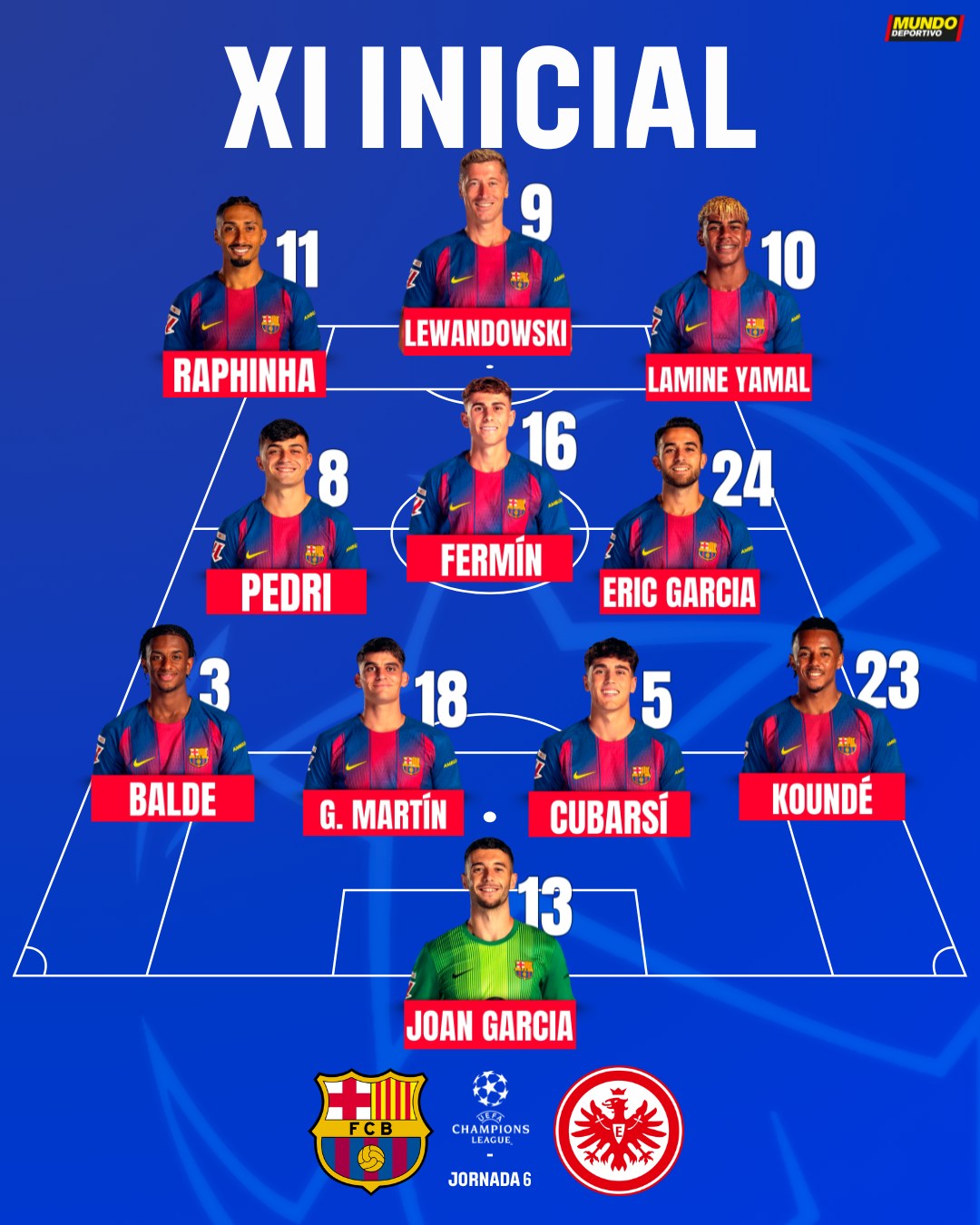 A csapatból négy játékos van sárga lapos veszélyben: Frenkie de Jong, Fermín López, Lamine Yamal és Marc Casadó, így ha valamelyikük sárgát kap, ki kell hagynia a Slavia Praha elleni idegenbeli BL mérkőzést. Hansi Flick nem számolhat Ronald Araújo, Gavi és Dani Olmo játékával sérülés miatt, míg a németeknél Jonathan Burkardt és Michy Batshuayi van a maródiak listáján. Hansi Flick csapata számára kötelező a győzelem, több okból is. Egyrészt, a legjobb nyolcba kerülésre még van esély, amihez a maradék három meccsen 9 pontot kell szereznünk! Másrészt pedig, elszámolnivalónk van a frankfurtiakkal a közelmúltban történt skandallum okán! Força Barça!